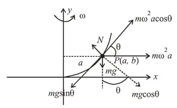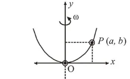 A bead of mass $m$ stays at point $P(a, b)$ on a wire bent in the shape of a parabola $y=4 C x^{2}$ and rotating with angular speed $\omega$ (see figure). The value of $\omega$ is (neglect friction) :