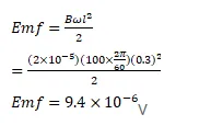 A bicycle is resting on its stand in the east-west direction and the rear wheel is rotated at an angular speed of 100 revolutions per minute. It the length of each spoke is $30.0 \mathrm{~cm}$ and the horizontal component of earth's magnetic field is $2.0 \times 10^{-5}$ T, find the emf induced between the axis and the outer end of the spoke. Neglect centripetal force acting on the free electrons of the spoke.