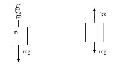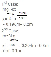 A block of $2 \mathrm{~kg}$ is suspended from the ceiling through a mass less spring of spring constant $\mathrm{k}=100 \mathrm{~N} / \mathrm{m}$. What is the elongation of the spring? If another $1 \mathrm{~kg}$ is added to the block, what would be the further elongation?
