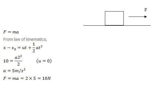 A block of mass $2 \mathrm{~kg}$ placed on a long frictionless horizontal table is pulled horizontally by a constant force $F$. It is found to move $10 \mathrm{~m}$ in the first two seconds. Find the magnitude of $F$.
