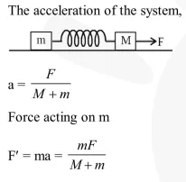 A block of mass $\mathrm{m}$ is connected to another block of mass $M$ by a spring (massless) of spring constant $\mathrm{k}$. The blocks are kept on a smooth horizontal plane. Initially the blocks are at rest and the spring is unstretched. Then a constant force $\mathrm{F}$ starts acting on the block of mass $\mathrm{M}$ to pull it. Find the force on the block of mass $m$ :-