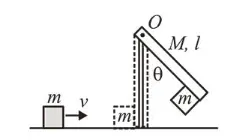 vertical rod and sticks to it as shown. The rod is pivoted about $O$ and swings as a result of the collision making angle $\theta$ before momentarily coming to rest. If the rod has mass $M=2 \mathrm{~kg}$, and length $l=1 \mathrm{~m}$, the value of $\theta$ is approximately: (take $g=10 \mathrm{~m} / \mathrm{s}^{2}$ )