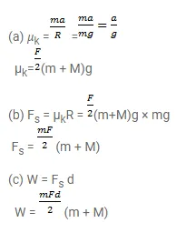 A block of mass $m$ is kept over another block of mass $M$ and the system rests on a horizontal surface (figure 8-E1). A constant horizontal force F acting on the lower block produces an acceleration $F / 2(m+M)$ in the system, the two blocks always move together. (a) Find the coefficient of kinetic friction between the bigger block and the horizontal surface. (b) Find the frictional force acting on the smaller block. (c) Find the work done by the force of friction on the smaller block by the bigger block during a displacement $d$ of the system.