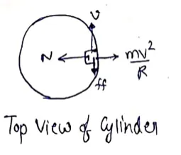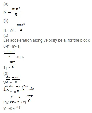 A block of mass $m$ moves on a horizontal circle against the wall of a cylindrical room of radius $R$. The floor of the room on which the block moves is smooth but the friction coefficient between the wall and the block is $g$. The block is given an initial speed $v_{0}$. As a function of the speed $v$ write (a) the normal force by the wall on the block, (b) the frictional force by the wall and (c) the tangential acceleration of the block. (d) Integrate the tangential acceleration $(d v / d t=v d v / d s)$ to obtain the speed of the block after one revolution.