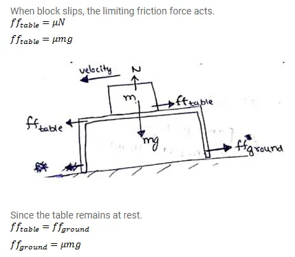 A block of mass $m$ slips on a rough horizontal table under the action of a horizontal force applied to it. The coefficient of friction between the block and the table is $\mathrm{g}$. The table does not move on the floor. Find the total frictional force applied by the floor on the legs of the table. Do you need the friction coefficient between the table and the floor or the mass of the table?