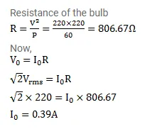 A bulb rated $60 \mathrm{~W}$ at $220 \mathrm{~V}$ is connected across a household supply of alternating voltage of $220 \mathrm{~V}$. Calculate the maximum instantaneous current through the filament.