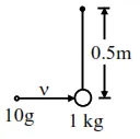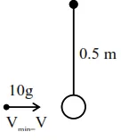 A bullet of $10 \mathrm{~g}$, moving with velocity $v$, collides head-on with the stationary bob of a pendulum and recoils with velocity $100 \mathrm{~m} / \mathrm{s}$. The length of the pendulum is $0.5 \mathrm{~m}$ and mass of the bob is $1 \mathrm{~kg}$. The minimum value of $v=$ $\mathrm{m} / \mathrm{s}$ so that the pendulum describes a circle. (Assume the string to be inextensible and $g=10 \mathrm{~m} / \mathrm{s}^{2}$ )