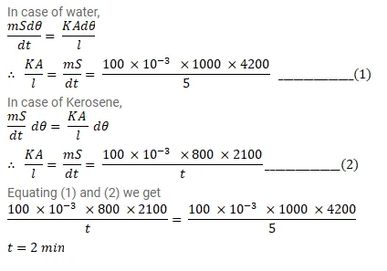 A calorimeter of negligible heat capacity contains $100 \mathrm{cc}$ of water at $40^{\circ} \mathrm{C}$. The water cools to $35^{\circ} \mathrm{C}$ in 5 minutes. The water is now replaced by K-oil of equal volume at $40^{\circ} \mathrm{C}$ Find the time taken for the temperature to become $35^{\circ} \mathrm{C}$ under similar conditions. Specific heat capacities of water and K-oil are $4200 \mathrm{~J} / \mathrm{kg}$ - $\mathrm{K}$ and $2100 \mathrm{~J} / \mathrm{kg}-\mathrm{K}$ respectively. Density of K-oil = 800 $\mathrm{kg} / \mathrm{m}^{3}$.