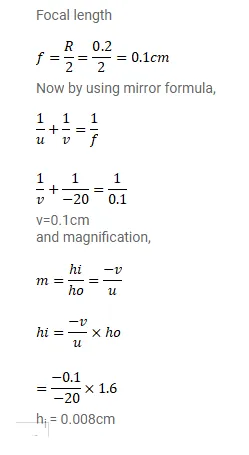 A candle flame $1.6 \mathrm{~cm}$ high is imaged in a hall bearing of diameter $0.4 \mathrm{~cm}$. If the ball bearing is $20 \mathrm{~cm}$ away from the flame, find the location and the height of the image.