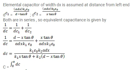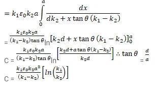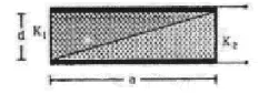 A capacitor is formed by two square metal-plates of edge a, separated by a distance $d$. Dielectrics of dielectric constants $K_{1}$ and $K_{2}$ are filled in the gap as shown in figure. Find the capacitance.
