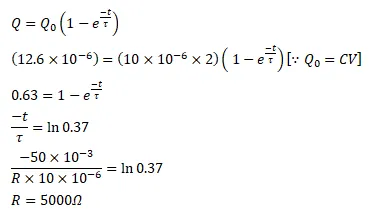 A capacitor of capacitance $10 \mu \mathrm{F}$ is connected to a battery of emf $2 \mathrm{~V}$. It is found that it takes $50 \mathrm{~ms}$ for the charge on the capacitor to become $12.6 \mu \mathrm{C}$. Find the resistance of the circuit.