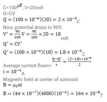 A capacitor of capacitance $100^{\mu \mathrm{F}}$ is connected to a battery of $20 v o l t$ for a long time and then disconnected from it. It is now connected across a long solenoid having 4000 turns per meter. It is found that the potential difference across the capacitor drops to $90 \%$ of its maximum value in $2.0$ seconds. Estimate the average the magnetic field produced at the center of the solenoid during this period.