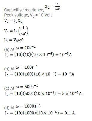 A capacitor of capacitance $10 \mu \mathrm{F}$ is connected to an oscillator giving an output voltage $\varepsilon=(10 \mathrm{~V}) \sin \omega \mathrm{t}$. Find the peak currents in the circuit for $\omega=10 \mathrm{~s}^{-1}, 100 \mathrm{~s}^{-1}, 500 \mathrm{~s}^{-1}, 1000 \mathrm{~s}^{-1}$.