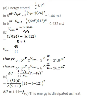 A capacitor of capacitance $5.00 \mu \mathrm{F}$ is charged to $24.0 \mathrm{~V}$ and another capacitor of capacitance 6 ' $0 \mu \mathrm{F}$ is charged to $12.0 \mathrm{~V}$.