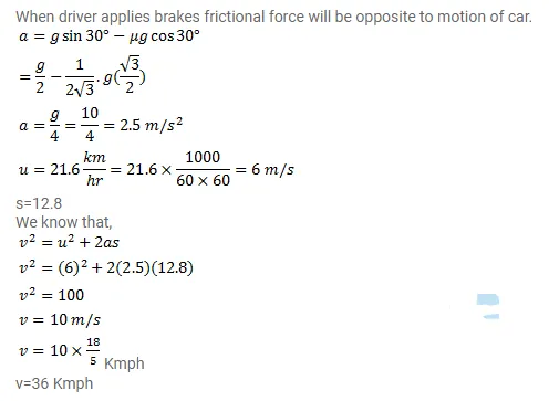 A car is going at a speed of $21.6 \mathrm{~km} / \mathrm{hr}$ when it encounters a $12.8 \mathrm{~m}$ long slope of angle $30^{\circ}$. The friction co-efficient between the road and the tyre is $\frac{\sqrt{3}}{2}$. Show that no matter how hard the driver applies the brakes, the car will reach the bottom with a speed greater than $36 \mathrm{~km} / \mathrm{hr}$. Take $\mathrm{g}=10 \mathrm{~m} / \mathrm{s}^{2}$.