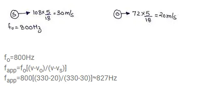 A car moving at $108 \mathrm{~km} \mathrm{~h}^{-1}$ finds another car in front it going in the same direction at $72 \mathrm{~km} \mathrm{~h}^{-1}$. The first car sounds a horn that has a dominant frequency of $800 \mathrm{~Hz}$. What will be the apparent frequency heard by the driver in the front car? Speed of sound in air $=330 \mathrm{~m} \mathrm{~s}^{-1}$.