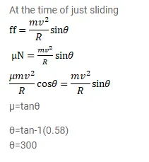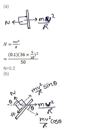 A car moving at a speed of $36 \mathrm{~km} / \mathrm{hr}$ is taking a turn on a circular road of radius $50 \mathrm{~m}$. A small wooden plate is kept on the seat with its plane perpendicular to the radius of the circular road (figure 7-E4). A small block of mass $100 \mathrm{~g}$ is kept on the seat which rests against the plate. The friction coefficient between the block and the plate is $1.1=0.58$. (a) Find the normal contact force exerted by the plate on the block. (b) The plate is slowly turned so that the angle between the normal to the plate and the radius of the road slowly increases. Find the angle at which the block will just start sliding on the plate.