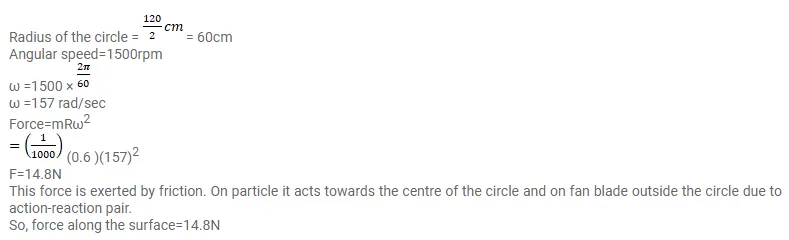 A ceiling fan has a diameter (of the circle through the outer edges of the three blades) of $120 \mathrm{~cm}$ and rpm 1500 at full speed. Consider a particle of mass $1 \mathrm{~g}$ sticking at the outer end of a blade. How much force does it experience when the fan runs at full speed? Who experts this force on the particle? How much force does the particle exert on the blade along its surface?