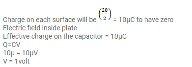 A charge of 20 micro coloumb is placed on the positive plate of an isolated parallel-plate capacitor of capacitance 10 microfarad. Calculate the potential difference developed between the plates.