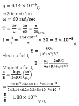 A charge of $3.14 \times 10^{-6} \mathrm{C}$ is distributed uniformly over a circular ring of radius $20.0 \mathrm{~cm}$. The ring rotates about its axis with an angular velocity of $60.0 \mathrm{rad} / \mathrm{s}$. Find the ratio of the electric field to the magnetic field at a point on the axis at a distance of $5.00 \mathrm{~cm}$ from the center.