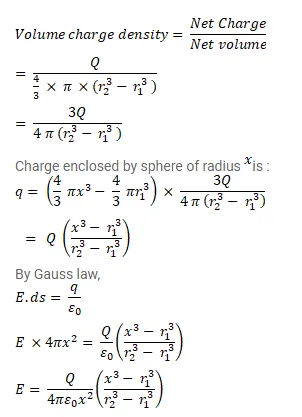 A charge $\mathrm{Q}$ is distributed uniformly within the material of a hollow sphere of inner and outer radii $r_{1}$ and $r_{2}{ }^{\circ}$ Find the electric field at a point $\mathrm{P}$ a distance ${ }^{x}$ away from the centre for $\mathrm{r}_{1}<\mathrm{x}<\mathrm{r}_{2}$ Draw a rough graph showing the electric field as a function of $x$ for $0<\mathrm{x}<2 \mathrm{r}_{2}$.