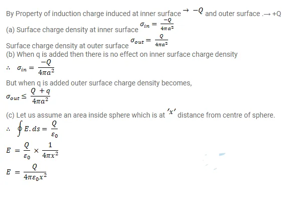 (b) If a charge $q$ is put on the sphere, what would be the surface charge densities on the inner and the outer surfaces? (c) Find the electric field inside the sphere at a distance $x$ from the centre in the situations (a) and (b).