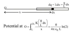 A charge $\mathrm{Q}$ is uniformly distributed over a long rod $\mathrm{AB}$ of length $\mathrm{L}$ as shown in the figure. The electric potential at the point $\mathrm{O}$ lying at a distance $\mathrm{L}$ from the end $\mathrm{A}$ is :--
