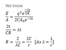 A charged capacitor of capacitance $\mathrm{C}$ is discharged through a resistance $\mathrm{R}$. A radioactive sample decays with an averagelife. Find the value of $\mathrm{R}$ for which the ratio of electrostatic field energy stored in the capacitor to the activity of the radioactive sample remains constant in time.