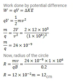 A charged particle is accelerated through a potential difference of $12 \mathrm{kV}$ and acquires a speed of $1.0 \times 10^{6} \mathrm{~m} / \mathrm{s}$. It is then injected perpendicularly into a magnetic field of strength $0.2 \mathrm{~T}$. Find the radius of the circle described by it.