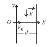 $y_{0}=\frac{1}{2} \cdot \frac{q E}{m}\left(\frac{d}{v_{0}}\right)^{2}=\frac{1}{2} \frac{q E d^{2}}{m v_{0}^{2}}$