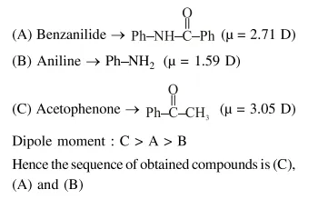 A chromatography column, packed with silica gel as stationary phase, was used to separate a mixture of compounds consisting of (A) benzanilide (B) aniline and $(\mathrm{C})$ acetophenone. When the column is eluted with a mixture of solvents, hexane : ethyl acetate $(20: 80)$, the sequence of obtained compounds :