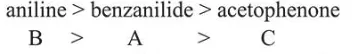 A chromatography column, packed with silica gel as stationary phase, was used to separate a mixture of compounds consisting of (A) benzanilide (B) aniline and (C) acetophenone. When the column is eluted with a mixture of solvents, hexane: ethyl acetate $(20: 80)$, the sequence of obtained compounds is: