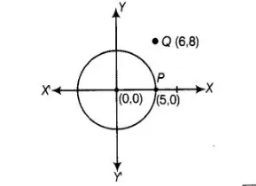 A circle has its centre at the origin and a point P (5, 0) lies on it. The point Q (6, 8) lies outside the circle.