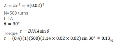 A circular coil of radius $2.0 \mathrm{~cm}$ has 500 turns in it and carries a current of $1.0 \mathrm{~A}$. Its axis makes an angle of $30^{\circ}$ with the uniform magnetic field of magnitude $0.40 T$ that exists in the space. Find the torque acting on the coil.