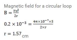 A circular loop of one turn carries a current of $5.00 \mathrm{~A}$. If the magnetic field $\mathrm{B}$ at the center is $0.200 \mathrm{mT}$, find the radius of the loop.