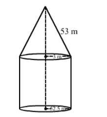 Curved surface area of the conical portion $=\pi r l=\left(\frac{22}{7} \times 52.5 \times 53\right) \mathrm{m}^{2}=8745 \mathrm{~m}^{2}$