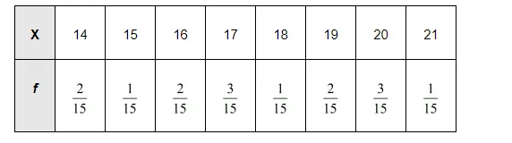 $=14 \times \frac{2}{15}+15 \times \frac{1}{15}+16 \times \frac{2}{15}+17 \times \frac{3}{15}+18 \times \frac{1}{15}+19 \times \frac{2}{15}+20 \times \frac{3}{15}+21 \times \frac{1}{15}$