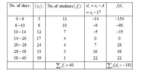 Now, we have $N=\sum f_{i}=40, \sum f_{i} d_{i}=181$ and $A=17$.
