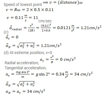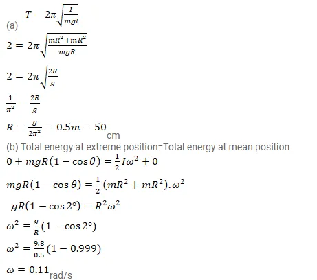 A closed circular wire hung on a nail in a wall undergoes small oscillations of amplitude $2^{\circ}$ and time period 2 s. Find (a) the radius of the circular wire, (b) the speed of the particle farthest away from the point of suspension as it goes through its mean position, (c) the acceleration of this particle as it goes through its mean position and (d) the acceleration of this particle when it is at an extreme position. Take $g=\pi^{2} \mathrm{~m} / \mathrm{s}^{2}$.