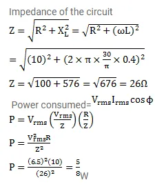 A coil has a resistance of $10 \Omega$ and an inductance of $0.4$ henry. It is connected to an Ac source of $6.5 \mathrm{~V}$, $\frac{30}{\pi} \mathrm{Hz}$. Find the average power consumed in the circuit.