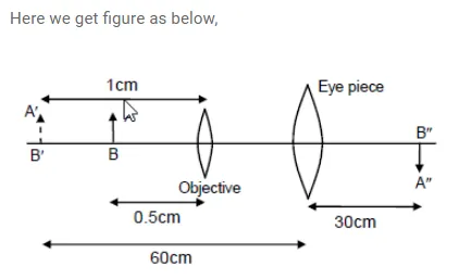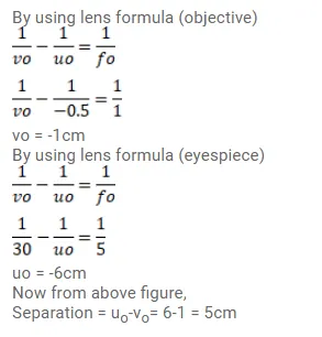 A compound microscope consists of an objective of focal length $1 \mathrm{~cm}$ and an eyepiece of focal length $5 \mathrm{~cm}$. An object is placed at a distance of $0.5 \mathrm{~cm}$ from the objective. What should be the separation between the lenses so that the microscope projects an inverted real image of the object on a screen $30 \mathrm{~cm}$ behind the eyepiece?