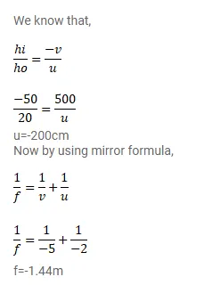 A concave mirror forms an image of $20 \mathrm{~cm}$ high object on a screen placed $5.0 \mathrm{~cm}$ away from the mirror. The height of the image is $50 \mathrm{~cm}$. Find the focal length of the mirror and the distance between the mirror and the object.