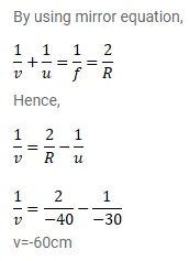 A concave mirror having a radius of curvature $40 \mathrm{~cm}$ is placed in front of an illuminated point source at a distance of $30 \mathrm{~cm}$ from it. Find the location of the images.