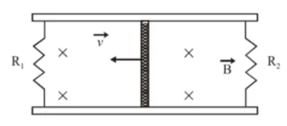 Two resistors $\mathrm{R}_{1}$ and $\mathrm{R}_{2}$ are connected across the ends of the rails. There is\