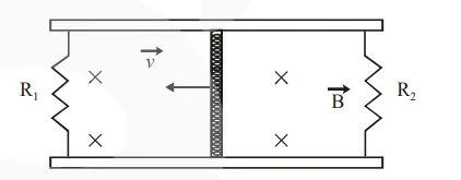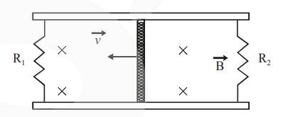 Two resistors $R_{1}$ and $R_{2}$ are connected across the ends of the rails. There is a uniform magnetic field $\vec{B}$ pointing into the page. An external agent pulls the bar to the left at a constant speed $v$.