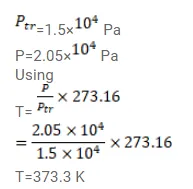 A constant volume thermometer registers a pressure of $1.500 \times 10^{4} \mathrm{~Pa}$ at the triple point of water and a pressure of $2.050 \times 10^{4} \mathrm{~Pa}$ at the normal boiling point. What is the temperature at the normal boiling point?