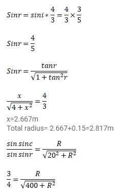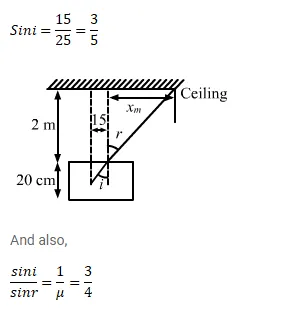 A container contains water up to a height of $20 \mathrm{~cm}$ and there is a point source at the center of the bottom of the container. A rubber ring of radius $r$ floats centrally on the water surface. (a) Find the radius of the shadow of the ring formed on the ceiling if $r=15 \mathrm{~cm}$ (b) Find the maximum value of $r$ which the shadow of the ring is formed on the ceiling refractive index of water $=4 / 3$.