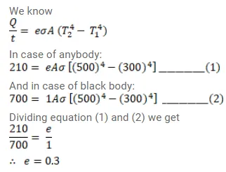 A copper sphere is suspended in an evacuated chamber maintained at $300 \mathrm{~K}$. The sphere is maintained at a constant temperature of $500 \mathrm{~K}$ by heating it electrically. A total of $210 \mathrm{~W}$ of electric power is needed to do it. When the surface of the copper sphere is completely blackened, $700 \mathrm{~W}$ is needed to maintain the same temperature of the sphere. Calculate the emissivity of copper.