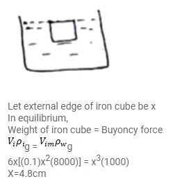 A cubical box is to be constructed with iron sheets $1 \mathrm{~mm}$ in thickness. What can be the minimum value of the external edge so that the cube does not sink ink water?