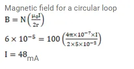A current-carrying circular coil of 100 turns and radius $5.0 \mathrm{~cm}$ produces a magnetic field of $6.0 \times 10^{-5} \mathrm{~T}$ at its center. Find the value of the current.
